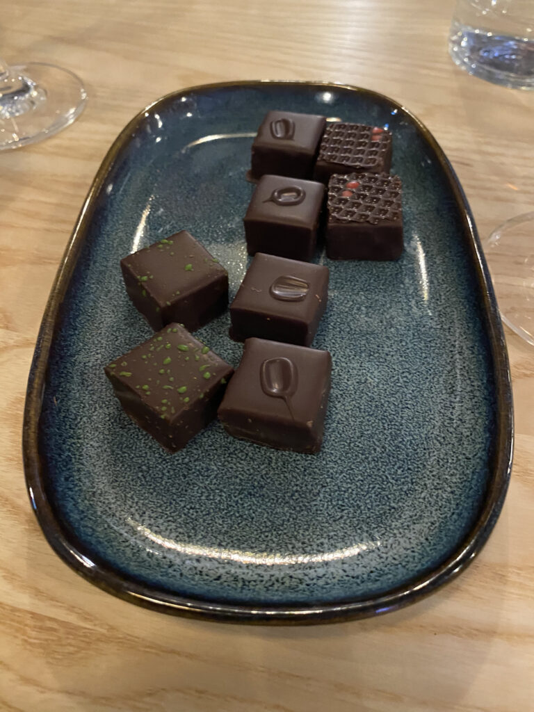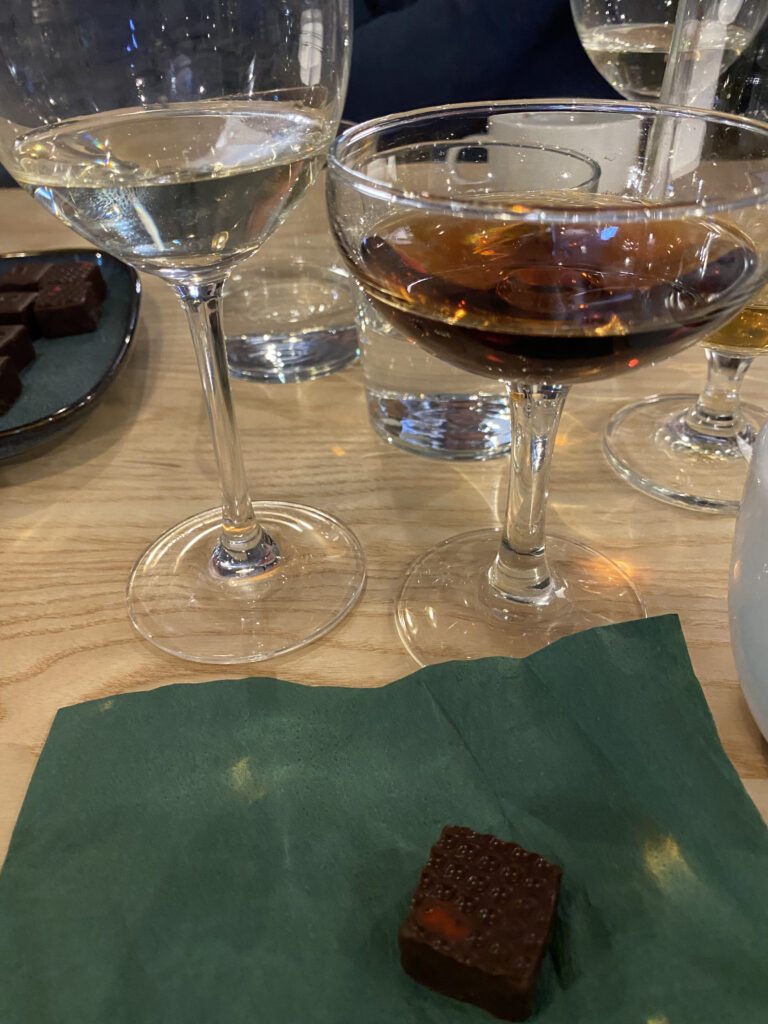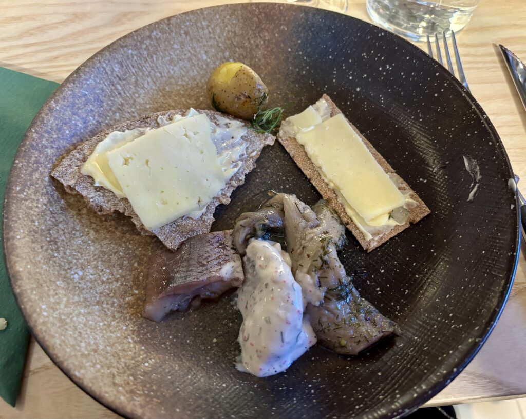 Middagen bestod av fyra serveringar där vi började med tre sorters sill med smörslungad potatis, bröd och ost. Den andra serveringen blev en tallrik med ”Annat från havet”, nämligen gravad och varmrökt lax, skagenröra och andra pikanta tillbehör. Sen kom varmrätten, en ångad torsk med saffransdoftande vitvinssås, ärtor, schalottenlök, sidfläsk, friterad lök och kokt potatis aparte. Det avslutande söta blev tre närproducerade chokladtryfflar som serverades med vald dryck, madeiravin alt. rabarberdryck från Färna odlingar.